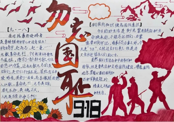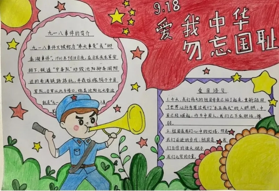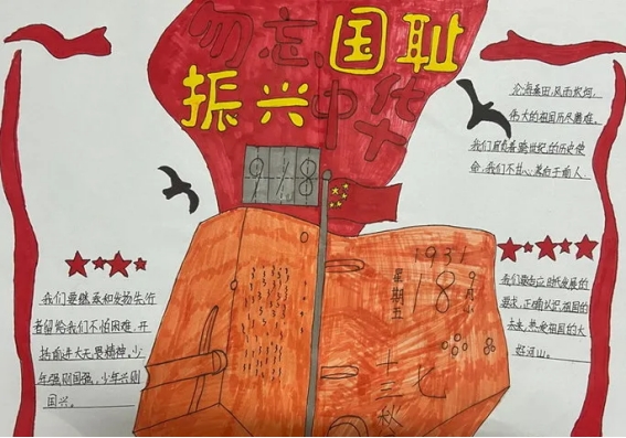 课后,同学们以画笔描绘历史,用文字书写感悟,他们精心设计版面,认真查找资料,将九一八事变的历史背景、经过和影响生动地呈现在手抄报上,以此表达浓浓的爱国之情。